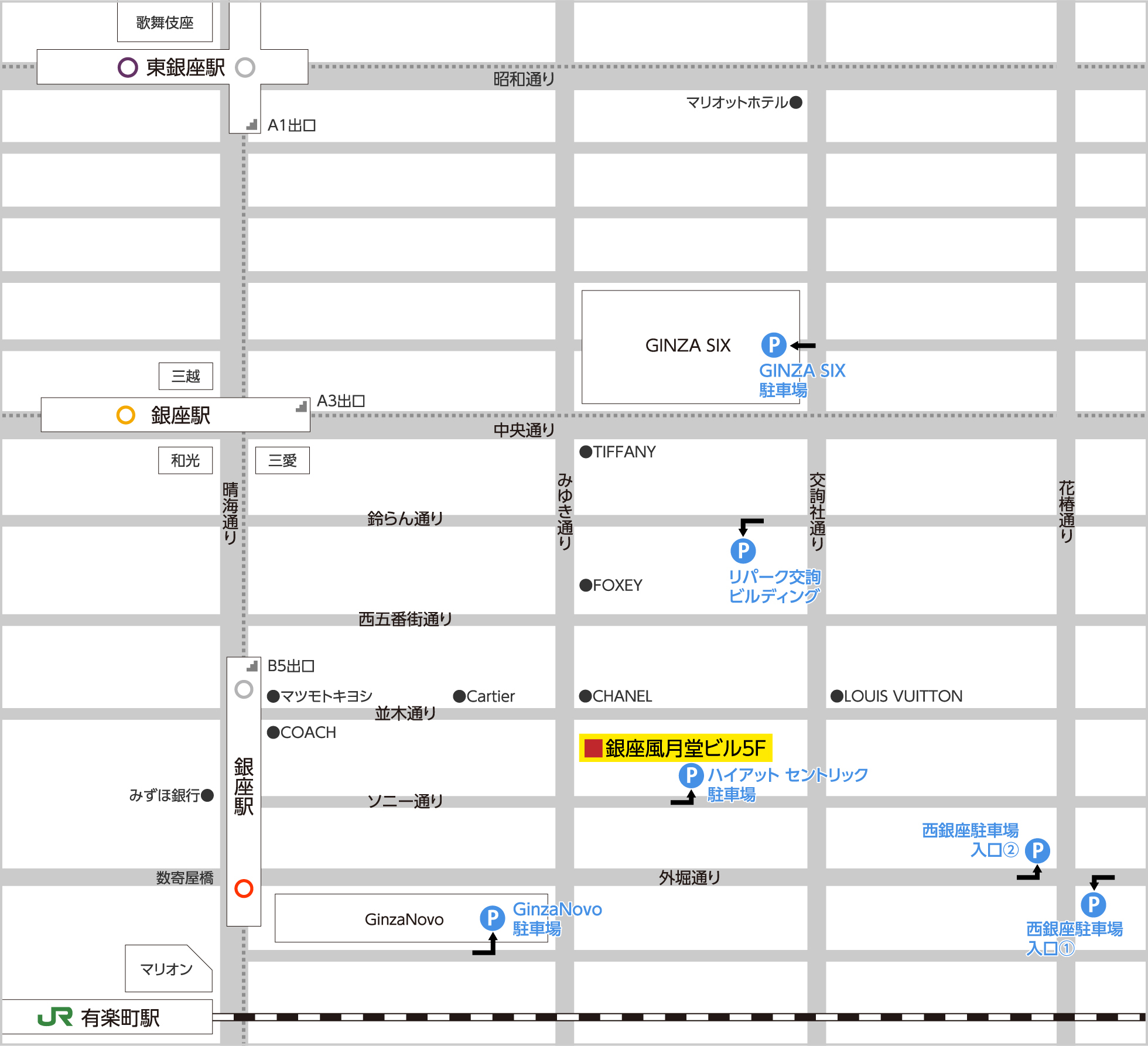 - 地下鉄「銀座」駅(日比谷線・銀座線・丸の内線) B5出口より徒歩2分